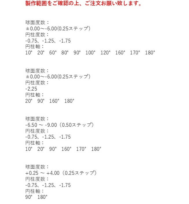 乱視度数 | -0.75、-1.25、-1.75、-2.25 |