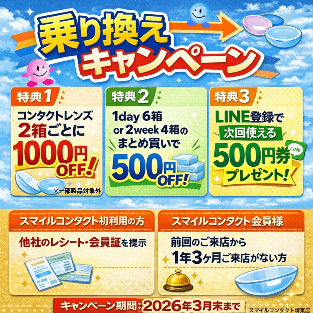 スマイルコンタクト堺東店★【2大キャンペーン】乗り換えキャンペーン・洗浄液特価キャンペーン
